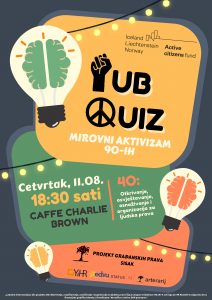 U sklopu projekta PGP Sisak će dana 11.08.2022., u četvrtak, s početkom u 18:00 sati na lokaciji Charlie Brown Caffe (Dr. Ante Starčević, 44000, Sisak) održati treću lokalnu intervenciju u Sisačko-moslavačkoj županiji pod nazivom Pub kviz „Mirovni aktivizam 90-ih“. Radi se o pub kvizu koji ima za cilj kroz interaktivan i zabavan način osigurati izgradnju inkluzivne i solidarne zajednice u kojoj je moguć suživot njenih građana bez obzira na nacionalost kojoj pripadaju… U glavnom dijelu intervencije odigrat će se pub kviz na kojem će sudjelovati nekoliko ekipa te će sudionici biti upoznati s važnošću mirovnog aktivizma i aktivnog građanstva u suvremenim društvima. U sklopu intervencije građani će imati priliku za razmjenu iskustava te ukazivanje na probleme u lokalnoj zajednici s ciljem kreiranja trajnog doprinosa za lokalnu zajednicu.