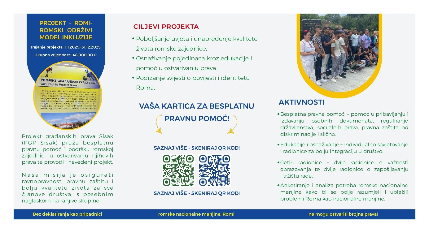 CRP Sisak also created a promotional project leaflet containing the basic rights of members of the Roma national minority, a project summary, and contact information for direct contact.